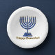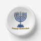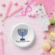 Happy Chanukah Gold Text mit einer blauen Menorah auf der Vorderseite und dreidel auf der Rückseite. Der Text für wen er von und nach ist auf der Rückseite.