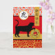 Happy Chinesisch Neujahr des Tiger, Papier Grußkarte mit einer Silhouette eines Tigers rollen eine Feng Shui Glück Münze auf der Straße. Blumenelemente befinden sich oben und unten auf der Karte. Ein goldenes Banner hängt mit Happy New Year geschrieben in Chinesisch. Ein kalligrafisches Zodiaksymbol für Tiger ist ebenfalls sichtbar. Art, Bild und Vers Copyright © Shoaff Ballanger Studios.