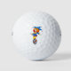Ein weißer Golfball mit einem Cartoon Clown und einem Einrad darauf. Der Clown hat orangefarbenes, lockiges Haar, eine rote Nase und trägt, einen blauen und gelben Schnitt, einen gelben Schlips und eine gelbe und weiße Hose. Das Bild ist eine digitale Illustration mit klaren Linien und hellen Farben.