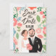 Mit dieser hübschen Save the Date-Karte mit Cartoon-Illustration eines glücklichen Ehepaares verkünden Sie Ihr Hochzeitsdatum mit einem Lächeln auf den Gesichtern Ihrer Gäste. Das skurrile Design zeigt das Paar, das Hände hält und vor Freude strahlt, vor einem Hintergrund blühender Blume und eines blauen Himmels. Diese Karte ist ideal für Paare, die gewollt haben, ihren Hochzeitsankündigungen eine Touch Spaß und Persönlichkeit hinzuzufügen. Die farbenfrohe Illustration und die fröhliche Atmosphäre werden Ihre Gäste begeistern, an Ihrem besonderen Tag teilzunehmen und Ihre Liebe zu feiern. Warten Sie nicht, das Wort zu verbreiten und lassen Sie Ihre Lieben mit dieser reizvollen Save the Date Karte lächeln!
