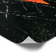 Eine farbenfrohe abstrakte Collage sitzt auf einem schwarzen Hintergrund, der mit weißen Kratzern gefüllt ist. In der Mitte dominieren Formen, die wie ein Teardrop über zerstörte Rechtecke wirken, mit hellgelben Blau- und Orangetönen. Endkappen mit hellblauen Blasen oben und orangefarbene scharfe Zähne unten verbinden sich mit einem rot-weiß gestreiften Akzent und schwarze Symbole beenden das Stück.