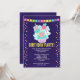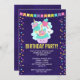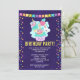 Einladung zum Geburtstag mit einer niedlichen Illustration mit einem Kuchen und Eis, die vor Freude lächeln. Ein Regenbogen und Herzen umgeben den zeichnend. Eine niedliche, flauschige Wolke lächelt auch vor Glück. Der Kuchen und das Eis haben darüber auch ein trendiges Einhornhorn. Eine farbenfrohe Banner-Abbildung erstreckt sich über die Oberseite. Farbenfrohe Konfetti an den Seiten. Niedliches und bezauberndes Design voller Freude.