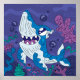 This charming and vibrant illustration depicts a friendly, stylized shark swimming in a whimsical underwater scene. The shark, predominantly in shades of blue and white, has a large, open mouth revealing jagged, but not menacing, teeth, and wide, expressive eyes. Its body is adorned with circular and wavy patterns. The surrounding deep blue-purple water is filled with various colorful elements of marine life, including pink coral, green and teal seaweed, and floating bubbles, all outlined in a darker shade. The overall style is cartoonish and playful, creating a lighthearted interpretation of the ocean and its inhabitants.