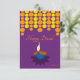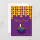 Happy Diwali Postkarte mit Tonöllampe und Gelb-Orange-Marigold-Blume-Girlanden. Entworfen von Liv