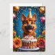 Ein fröhlicher Hund, der ein Party trägt, das mit einem lebendigen Kuchen und festlichen Dekorationen zum Geburtstag einlädt und eine fröhliche, feierliche Atmosphäre schafft.