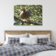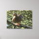 Eine glücklich aussehende Mallard-Henne sitzt auf einem Ast am Roath Park Lake, Cardiff.