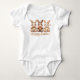 This baby bodysuit features 3 cute bunnies in tan and brown plaid and animal prints, with pink hearts around them. One bunny has a pink coquette pink bow, and they all have charming expressions. The bunnies are reminiscent of a child's stuffed animals. The text "Happy Easter" appears in a pretty script underneath the design.