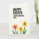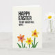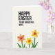 Designed with an off-white background and lots of open space, this card keeps the focus on a loving Easter message. Across the upper two-thirds, large black sans-serif letters read “HAPPY EASTER TO MY BEAUTIFUL WIFE,” centered and easy to spot at a glance. The strong lettering feels like a direct note from one partner to another, like a warm hand squeeze in written form 🌷. Below the text, three stylized spring flowers sit in the lower third, adding color without crowding the layout. The petals are sunny yellow, warm orange, and coral-peach, each with a darker center that gives a gentle sense of depth. Dark green stems and leaves anchor the bouquet, and the blooms vary slightly in height with a small, charming asymmetry 🐇. The flowers rest along the bottom edge, their flat shapes and smooth fills standing out against the pale background.