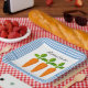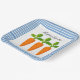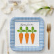Mit einer Papiertafel im Bauernstil schaffen Sie einen festlichen Frühling- oder Osterferien-Tisch. Auf diesem Teller stehen drei Karotten inmitten eines cremefarbenen, weißen Hintergrunds mit einer blauen Gingham-Grenze. Sehen Sie sich andere Möbel in meiner Spring Cards and Gifts Kollektion an.