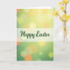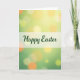 Designed with a soft spring look, this card centers on a wide horizontal band of muted ivory that feels like a calm stage for the greeting. The words “Happy Easter” sit in the middle of that band in a deep leafy green, with smooth, flowing letterforms that look friendly and a little romantic, like a note meant for someone special 🐰. Behind the band, the background fades from a light lime green near the top into a deeper garden green toward the bottom, giving the scene a gentle, outdoorsy setting. Scattered across the greens are glowing, out-of-focus circles that resemble sunlit sparkles, adding a cozy, shared-moment feel, as if two friends are strolling together under spring trees 🌷. The light dots shift in size and brightness, mixing soft yellow, creamy white, and warm orange tones that suggest late-afternoon sunshine. The centered text stands out clearly against the pale strip while the surrounding glow keeps the look airy and dreamy. Large and small luminous circles float across the green gradient, with the brightest ones clustered near the middle and fading softly toward the edges.