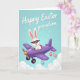 This greeting card features a long-eared white bunny flying a purple biplane high in a bright blue sky, with a cheerful grin that feels like it’s meant for someone special 🐰. The bunny wears shiny black aviator goggles, leaning forward as if eager to reach a loved one. Below the plane, soft white clouds stretch along the bottom edge, giving the scene a light, airy setting. Hanging beneath the lower wings are three pastel oval decorations with striped patterns, like little gifts being delivered with care 🌷. Across the upper area, the message “Happy Easter grandson” appears in white lettering that curves gently over the sky. The purple aircraft stands out against the blue background, with subtle shading that rounds out the wings and body. The bunny’s bright eyes and open smile add a friendly, affectionate energy, like a warm hello sent from far away. The striped ovals are shown in soft pastel tones, suspended neatly in a row under the wings.