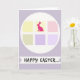 This greeting card features a soft lavender background with a large white circle centered like a spotlight on the design. Inside the circle sits a neat grid of six pastel squares with slightly uneven edges, giving the layout a gentle, cozy look. The squares mix pale yellow, light pink, muted green, and several shades of lavender, arranged so the colors feel like they’re keeping close company. In the top-middle square, a hot pink hare silhouette stands upright 🐇, drawing the eye the way two friends might lean toward each other in a photo. Beneath the circle, a white banner stretches across the lower area with the words “HAPPY EASTER...” placed in the middle in a casual, hand-drawn style. The lettering appears in a dark ink tone that contrasts clearly against the white strip, while the ellipsis trails off softly as if inviting a quiet smile 🌷. The hot pink hare sits sharply against a pale yellow square, framed by the surrounding pastel tiles.