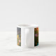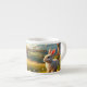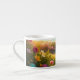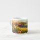 A picturesque spring landscape with rolling hills and blossoming trees stretches out in an idyllic, sunlit valley. A bright white Easter bunny sits attentively in the grass, surrounded by colorful, artfully decorated Easter eggs. The flowers in vibrant colors and the warm golden light of the setting sun lend the scene a peaceful and festive atmosphere. The elegant lettering "Happy Easter" hovers above the scene, underlining the festive mood.