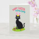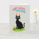 This design shows a stylized black cat sitting on a small patch of green grass near the lower middle, gazing forward with wide aqua-blue eyes and a tiny pink nose that feels sweet and a little bashful 🐰. Bright pink bunny ears rest on its head, topped with a small yellow flower, like a flirty spring costume shared between close friends. Above the cat, the words “HAPPY EASTER” curve in coral-pink lettering across the upper area. Just beneath that, “to Every Bunny” appears in teal lettering, set in a smooth, flowing style that softens the message. To the left of the cat sits a small brown woven basket, angled slightly as if it was just set down by someone nearby. To the right lies an orange carrot with crisp green leaves, balancing the scene and adding a cozy, companionable touch 🐇. The background is a soft greige tone, and the simple flat shapes keep the pink ears, yellow flower, and coral-and-teal text standing out clearly.