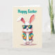 This greeting card features a stylized white rabbit standing upright on a soft cream background, with pink inner ears and faint rosy cheeks that make it look friendly 🐰. The rabbit wears black sunglasses with lenses that shift through a rainbow-like gradient, giving its smile a cool, easygoing charm that feels like a wink shared with a close friend. A zip-up jacket steals the spotlight with a smooth color fade from teal into orange and yellow, like it’s dressed for a cheerful spring stroll. The jacket includes a fuzzy-looking orange collar plus ribbed blue cuffs and hem, adding cozy detail to the modern outfit. Near the top of the design, the words “Happy Easter” appear in large turquoise letters, centered above the rabbit to echo the teal tones in the jacket 🌷. Soft, diffused lighting creates gentle shadows beneath and around the figure, keeping the scene simple while still grounded. The rabbit’s open-mouthed grin and relaxed stance suggest a warm, affectionate hello without needing any extra background elements. The minimal setting stays uncluttered, with the turquoise text floating above the rabbit against the muted cream space.