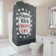 Fett formatierter Text mit dem Titel "Happy Ehefrau Happy Life" zentriert sich vor einem grauen Hintergrund. Der schwarz-rote Text sitzt auf einem weißen Rechteck mit großen, texturierten weißen Punkten, die einen spielerischen Kontrast zum Hintergrund der soliden Farbe bieten.