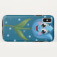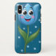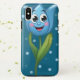 Ein lebhaftes Telefongehäuse mit einem fröhlichen blauen Blume-Charakter mit einem lächelnden Gesicht. Die Blume hat große ausdrucksstarke Augen und rosige Wangen, Set vor einem tiefen Teelager-Hintergrund. Um die Blume herum sind verspielte, verstreute weiße Polka Punkte.
