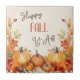 Diese farbenfrohe Kachel ist perfekt für die Herbstsaison geeignet und zeigt eine von Blätter gerahmte Weinlese mit orangefarbenen Kürbissen. Der Text in der Mitte sagt "Happy FALL Y'All" in braun und orange. Alles ist auf einem hellbeigen Hintergrund angeordnet.