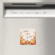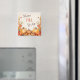 Dieser farbenfrohe Magnet ist perfekt für die Herbstsaison geeignet und zeigt eine von Blätter gerahmte Weinlese an Orangenkürbis. Der Text in der Mitte sagt "Happy FALL Y'All" in braun und orange. Alles ist auf einem hellbeigen Hintergrund angeordnet.