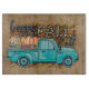 Kürbisantiker blauer LKW mit Happy Fall Y'all in Leopardendruck auf einem Herbst kariert Not leidenden Hintergrund.