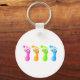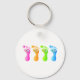 Eine Reihe von vier bunten menschlichen Fußabdrücken mit glücklichen Gesichtern.