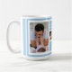 Einzigartige Geschenkidee für den Erstvater - Eine moderne Foto-Kaffee-Tasse mit einem Collage-Gitter aus 5 Bildern und Nachricht auf einem trendigen blauen Farbblock.