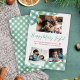 Rustikale stilvolle Familienkollage Happy Merry Joyful Christmas Green Script-Karte mit Ihrem drei benutzerdefinierten Foto und vollständig anpassbaren Text mit Beilagen von Pine Green Büffel karierte Muster auf einem weißen Hintergrund. +++++++++++++++ Einfach mit Ihren Bildern, Wünschen und Signaturen personalisieren!