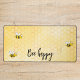 Gelber, weißer Hintergrund mit Wabenmuster. Mit fröhlichen, lächelnden Hummeln dekoriert. Text: Beglückt sein