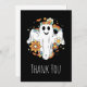 Vielen Dank Karte mit einer Abbildung eines lächelnden Geistes. Dekoriert mit Blume, Regenbogen und Fledermäusen.