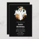 Einladung zum Geburtstag mit einer Illustration eines lächelnden Geistes. Dekoriert mit Blume, Regenbogen und Fledermäusen.