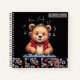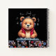 Ein lustiges Notebook mit einem Happy Grizzly Bären DJ, der große Kopfhörer trägt und Musik auf Turntable spielt. Musik-Dschungeltexte und Noten, die herumschweben.