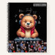 Ein lustiges Notebook mit einem Happy Grizzly Bären DJ, der große Kopfhörer trägt und Musik auf Turntable spielt. Musik-Dschungeltexte und Noten, die herumschweben.