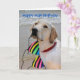Labrador Retriever am Strand mit bunt gestreiftem Bikini-Top in seinem Mund zum humorvollen halben Geburtstag.