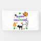 Dieses Banner enthält die Worte "Happy Halloween" in einem spöttischen Schriftart mit lila und grünen Buchstaben, umgeben von einer Sammlung von Halloween-Themen-Aufklebern in diesem spöttischen Thema und Stil. Dieses Banner hat einen Außensafe mit Single-Seitendruck von 1,6"x3", der mit einer eleganten matten Oberfläche gefertigt wurde. Es ist sowohl verblassfest als auch reißfest für Indoor- oder Outdoor-Nutzung, ideal für Werbung von Geburtstagen bis Abschluss, Hochzeiten bis Jahrestage. Mit Metallgrommen können gezwirnte und thermisch geschweißte Kanten für feine Outdoor-Banner gekauft werden.