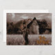Der beängstigende Skelettbaum steht auf dem Feld und hält seinen rostigen Schwung, hinter ihm steht eine alte, rustikale, in Not geratene Scheune im Land. Glücklicher Halloween-Gruß in der unteren rechten Ecke.