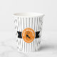 Dieser Papierbecher enthält eine schwarze Halloween-Katze auf einem orangefarbenen und schwarzen Etikett mit dem Text 'Happy Halloween' in Weiß. Personalisieren Sie Ihre Daten mit Ihrem Namen oder einem anderen Text. Hintergrund ist ein schmales schwarzweiß gestreiftes Muster. Suchen Sie ID686, um weitere Produkte mit diesem Design zu sehen.