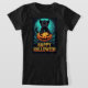 Cute black panther kitten perched on a bright orange pumpkin with teal leaves above bold leopard-print “Happy Halloween” lettering. Playful, festive and whimsical artwork ideal for seasonal cards and decor.