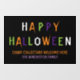 Fröhlich Halloween bunte, sprichwörtliche Typografie Halloween Spaß Verzierung Fenster klammern. Orange, grüne, lila, weiße, farbige Typografie, schwarzer Hintergrund. Anpassbarer Text und Familienname am unteren Rand des Zeichens. Ideal für Häuser, Geschäfte oder Geschäfte.