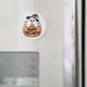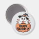 Glücklicher Halloween-Koffein-Geist-Magnet. In einem riesigen Kürbis schluckt ein Geist Kaffee unter seinen gekrönten Hexenhut. Boo-hoo? Es kichert, der Schaumkeule strahlt. Fröhliches Halloween, Koffeinfreunde bleibe spukhaft und wach!