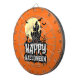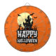 Gute Halloween Textil-Illustration mit Spuk Haus-, Friedhof- und Fledermausdekoration auf grunge-orangefarbenem Hintergrund.