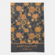A cute and pretty Happy Halloween kitchen towel featuring pumpkin and floral patterns in orange and black, perfect for families looking for fun and modern ways to celebrate Halloween this fall.