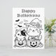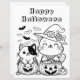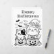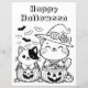 Glückliche Halloween-Farbseite für Kinder. Niedliche Halloween Katzen, Fledermäuse und Kürbis.