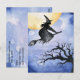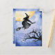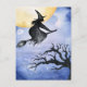 Vergnügungs Wasserfarbe Halloween Themenkarte mit einer fliegenden Hexe, spukiger alter Baum und Erntemond. Personalisieren Sie eine Nachricht an Ihre Enkel, Freunde oder Familie.