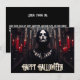 Gotisch inspiriert Halloween-Design mit einer geheimnisvollen schwarzen Figur mit dramatischen Make-up, Set zwischen roten Kerzen und dunklen Säulen der Kathedrale. Ideal für gespenstische Gruß, unheimliche Atmosphäre und kreative saisonale Visuals.