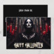 Gotisch inspiriert Halloween-Design mit einer geheimnisvollen schwarzen Figur mit dramatischen Make-up, Set zwischen roten Kerzen und dunklen Säulen der Kathedrale. Ideal für gespenstische Gruß, unheimliche Atmosphäre und kreative saisonale Visuals.