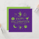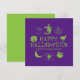 Frohe Halloween individuelle Name Grußkarte, Einladung lila und grün mit anpassbarer Text-Kürbislaterne, Kürbis, Hexe, Geist, Schädel, Mond, Schwarzkatze