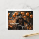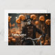 Halloween Skelett auf dem Fahrrad und Kürbis Dekorationen im Hintergrund. Postkarte mit Halloween