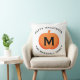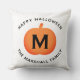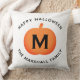 Herbstkissen mit orangefarbenem Kürbis mit weißem, individuellem Monogramm-Initial und moderner "Happy Halloween"-Formulierung mit personalisiertem Familiennamen. Zwei Kissen in Orange, Schwarz und Weiß.