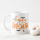 Diese lustige Halloween-Tasse sagt "Happy Halloween" in einem orangefarbenen Zierskript zusammen mit vier schwarzen Fledermäusen, die in der Nähe herumschweben.