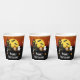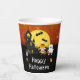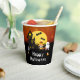 Diese lustige und spukhafte Papiertasse besticht durch eine niedliche Hexe und einen Geist neben einem gekräuselten Spuk Haus. Im Hintergrund ist ein Vollmond mit Fledermäusen und ein orangefarbener Nachthimmel mit Sternen. Das ist perfekt zu Halloween.